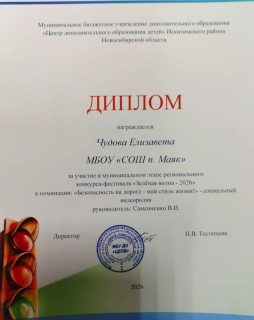 Безопасность на дороге — это важно! И здорово, что наши дети об этом говорят! Поздравляем Чудову Елизавету, ученицу 4 класса, с участием в муниципальном этапе регионального конкурса‑фестиваля «Зелёная волна‑2026»!